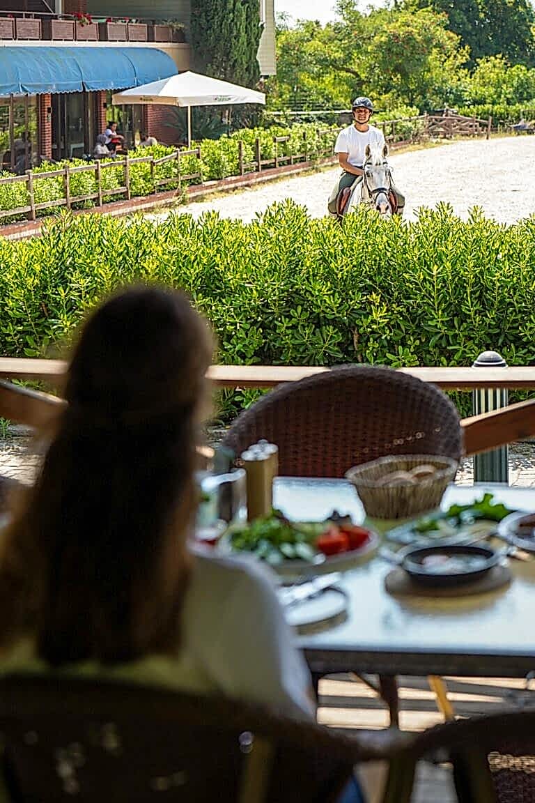 Restoranımız, otelimizin ana binasında yer almaktadır. Siz leziz yemeklerinizi yerken açık ya da kapalı manej de çalışan at ve binicileri izleme şansınız olacaktır. Gün içerisinde çok rahatlıkla aperatif yiyeceklerden veya yöresel lezzetlerden faydalanabilirsiniz. Şefimiz yöresel lezzetlere ait ürünleri bizzat mutfakta kendisi hazırlamaktadır.